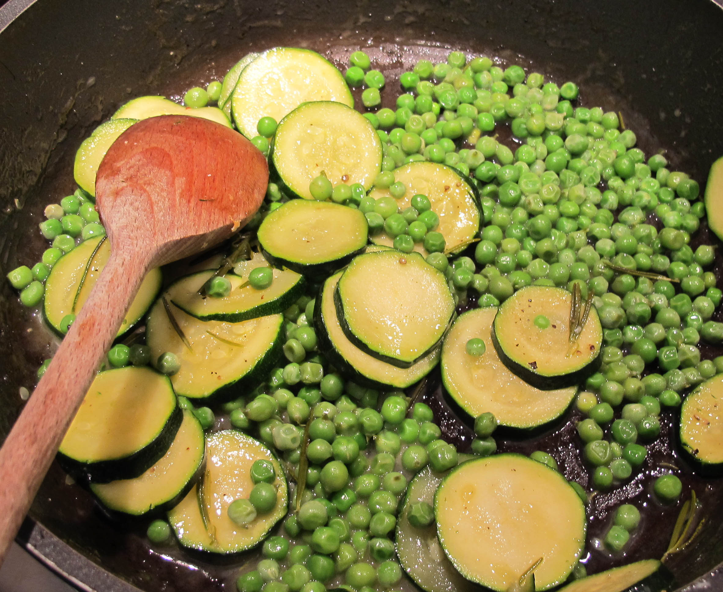 Put a splodge of olive oil in a pan (really a teaspoon full is fine) and very gently cook and coat the courgette; don’t let them brown. Then add some good chicken stock (maybe a mug full) and let everything simmer for three or five minutes. Then add some fresh rosemary and the peas and cook for a minute more, Add fresh pepper – and if you want a teaspoon or butter. If it has dried, add some of the water from the peas.